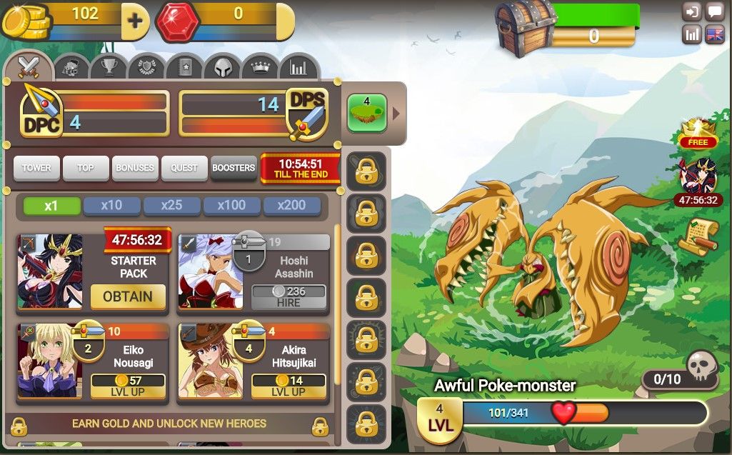 As a clicker game, you do not have much to do aside from clicking a monster non-stop to decrease its HP. You can buy new ‘heroes’ or ‘heroines’ and upgrade their skills with the dropped cash the monster gives upon defeat.